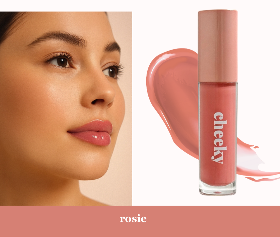 Get your glow on with our Cheeky Lip Gloss in “Rosie” – a delicate blend of rose-petal pink and luscious shine!